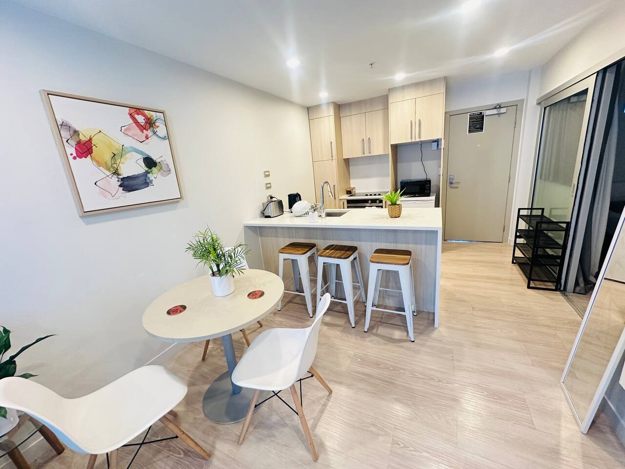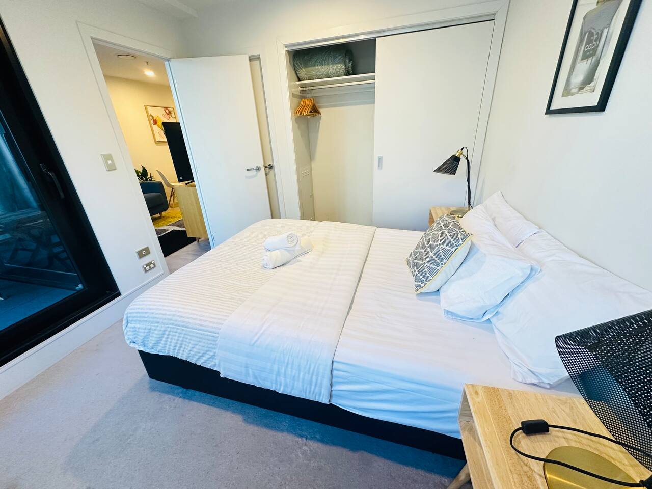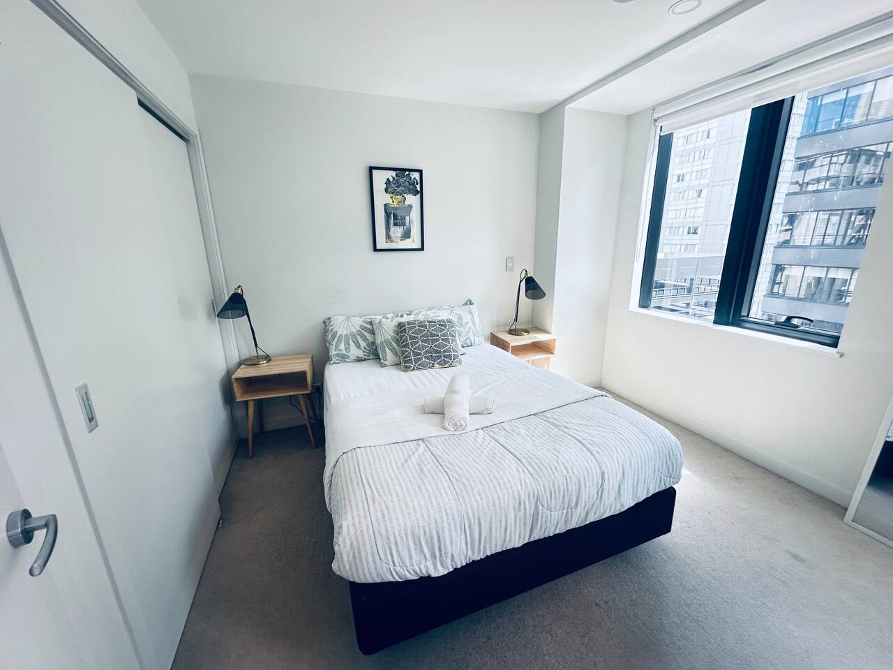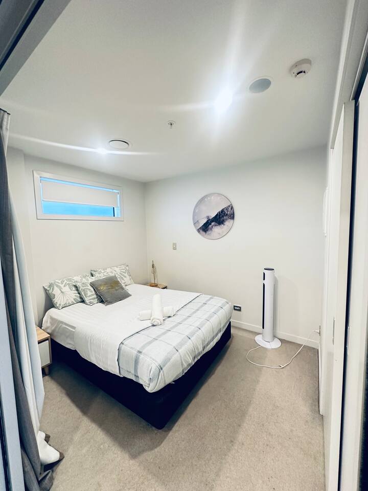 This modern 2-bedroom apartment offers a comfortable and stylish retreat in the heart of Auckland. The spacious living room is perfect for relaxing or socializing, featuring cozy seating and a flat-screen TV. The fully equipped kitchen allows for easy meal preparation, and the dining area is ideal for enjoying family meals together. The first bedroom features a double bed, while the second bedroom offers another double bed. For extra flexibility, 2 single floor mattresses are available, comfortably sleeping up to 6 guests. The apartment is bright and airy, with large windows offering fantastic views. The bathroom is clean and modern, with a shower, sink, and toilet. Fresh towels and linens are provided for your convenience. With its central location, this apartment is perfect for those looking to explore Auckland's vibrant city life, while enjoying a relaxing space to unwind.